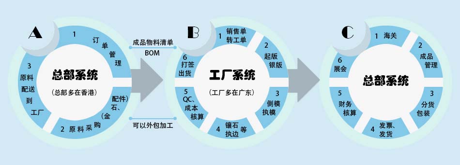 香港系统负责报价、报关、运输、发票、财务、采购等。工厂系统负责订单、生产单、接收香港来的原料、生产、工单监控、物料监控、损耗、工费、外包、财务核算、本地采购、品检、出货、展会等诸多环节。香港系统和工厂系统通过VPN连接、自动进行数据通讯。